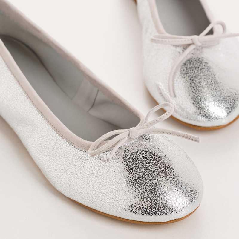 La Carmen Crack revisite l’élégance classique avec un twist contemporain. Grâce à son cuir métallisé craquelé, elle capte la lumière de façon unique, créant un jeu subtil d’ombres et de reflets. Le petit nœud à l’avant ajoute une touche féminine délicate, tandis que la platitude maîtrisée et la semelle cuir assurent un confort optimal toute la journée. Alliant originalité et sobriété, cette ballerine est l’atout mode parfait pour sublimer vos looks, décontractés ou plus formels.