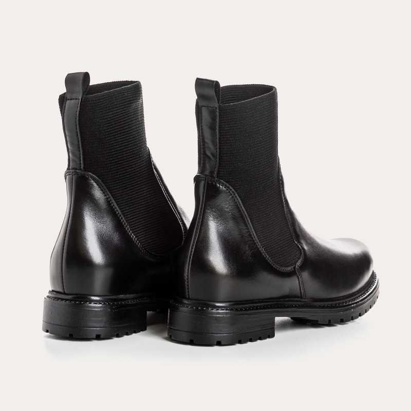 Élégantes et faciles à porter, les bottines Evelyn revisitent la chelsea boot en cuir noir. Leur tige élastiquée de 16 cm épouse la cheville pour un chaussant confortable et un style épuré. Avec talon de 3 cm et semelle cuir, elles conjuguent confort et allure. À porter avec jean slim, jupe midi ou pantalon tailleur pour une silhouette moderne.