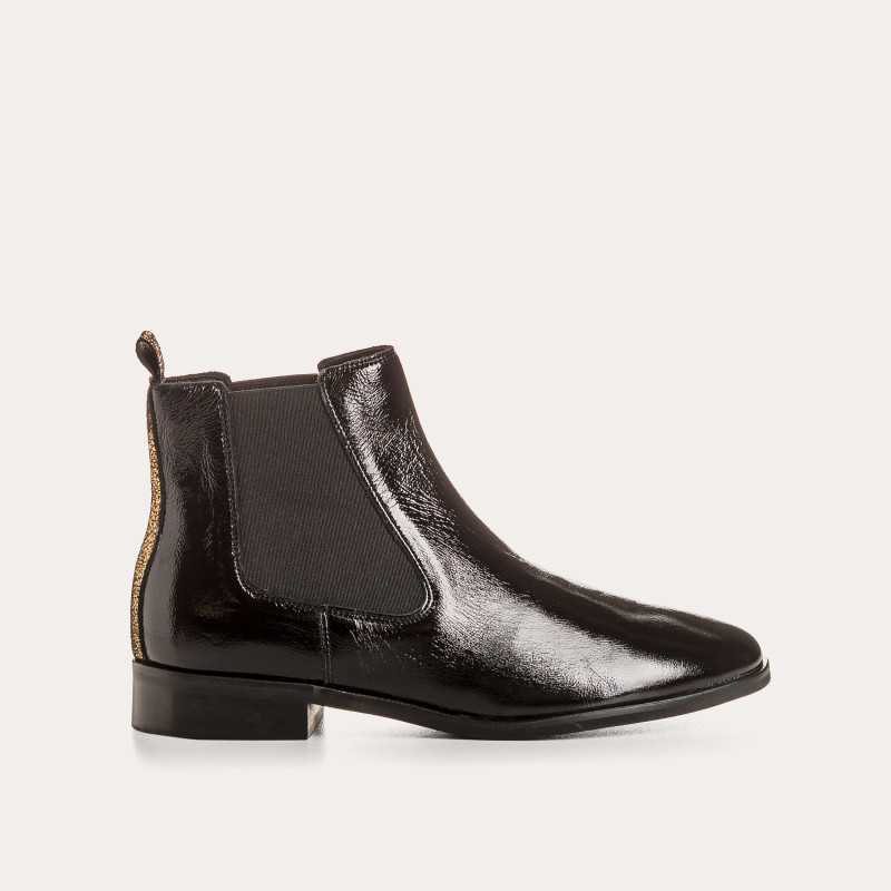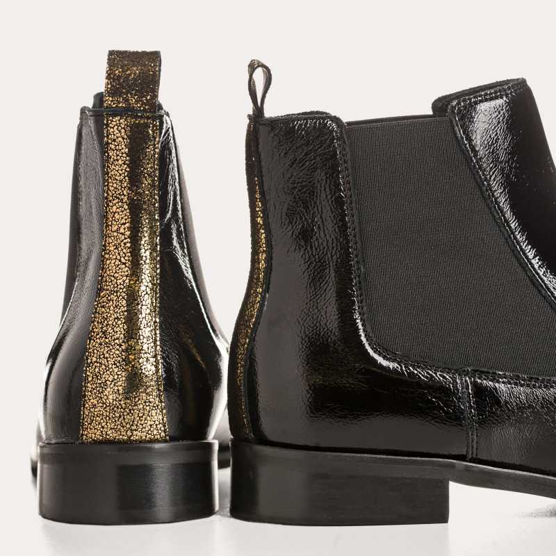 Modernes et lumineuses, les bottines Zellie en cuir vernis Naplak se distinguent par leurs empiècements dorés, pour une allure affirmée qui twiste un look classique ou dynamise un style minimaliste. Confectionnées en cuir vernis avec semelle intérieure cuir, elles offrent confort et souplesse. Leur tige élastiquée de 10 cm facilite l’enfilage, tandis que le talon de 2 cm allie praticité et élégance. Ce modèle taille petit : nous vous conseillons de choisir une pointure au-dessus de votre taille habituelle.