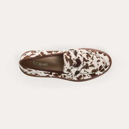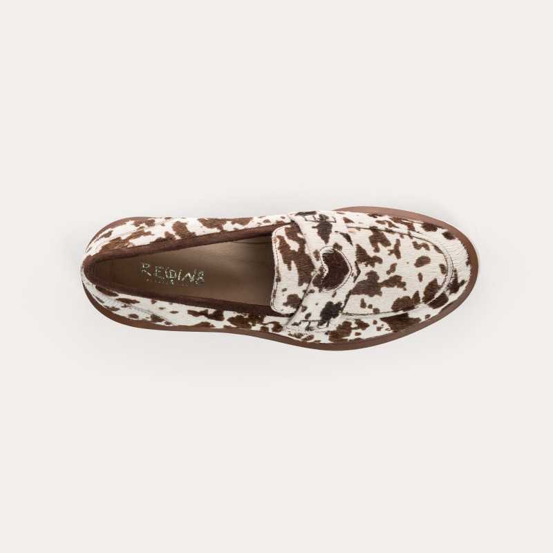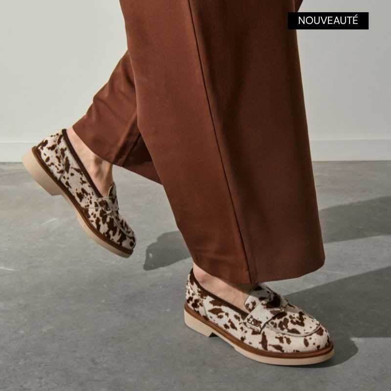 Une silhouette raffinée se dessine avec les mocassins Jack en cuir imprimé vache. Ce modèle collège orné d'un coeur doré garantit une silhouette authentique et une démarche stable. On aime le caractère de la matière qui réveille un look sobre. Côté look : portez-les avec un pantalon cigarette noir et un trench-coat classique pour un style preppy parisien. Le choix idéal pour une allure soignée en toute occasion.